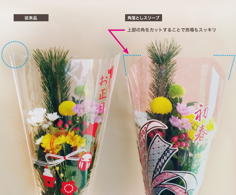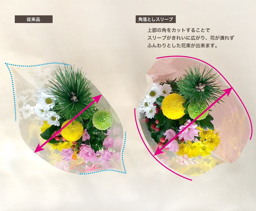 スリーブの角をカットしてあるので 花束が丸くきれいに仕上ります。